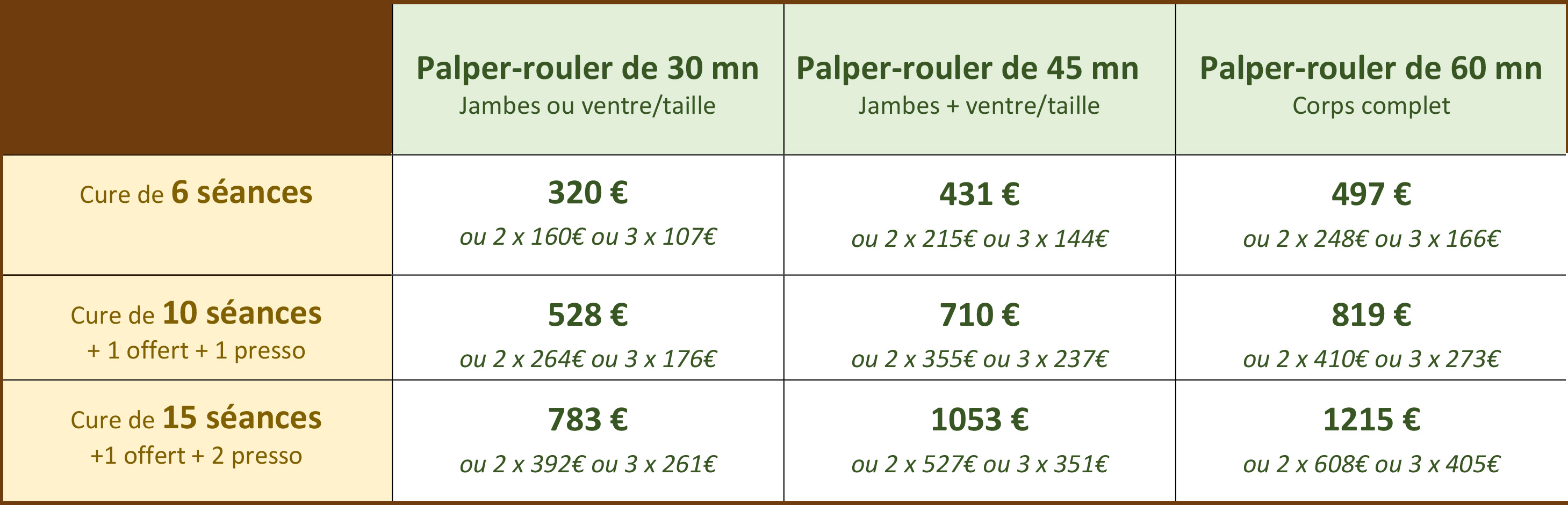 | Palper-rouler Manuel - jambres + ventre + taille 45mn | 78€ |