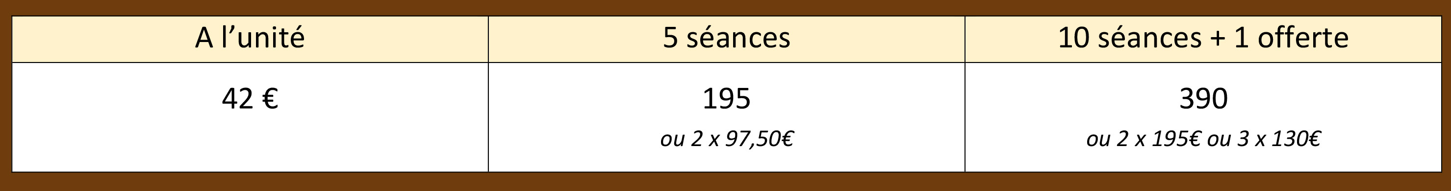 Tarif à l’unité : 30 mn : 58€ - 45 mn : 78€ - 60 mn : 90€