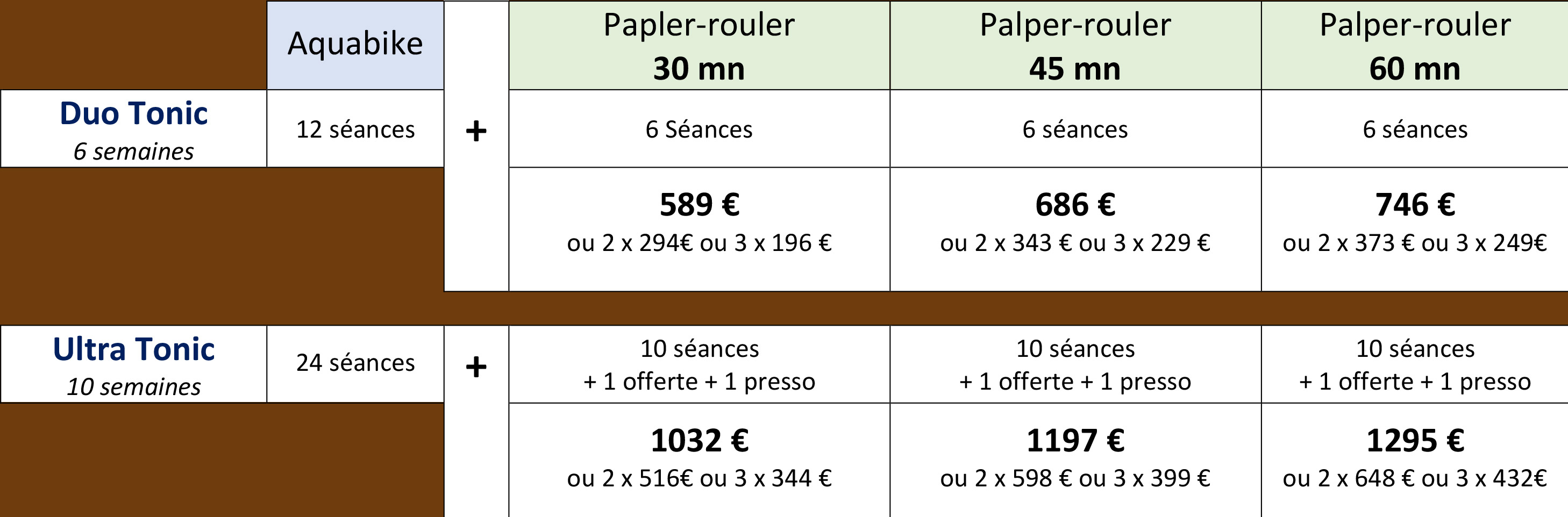 | Bilan Minceur Aquabiking (30mn) + Palper-rouler (20mn) | 68€ |